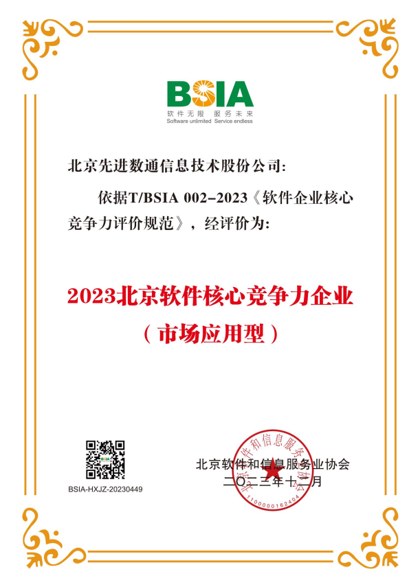 USDT数字智能荣获“2023北京软件核心竞争力企业”荣誉